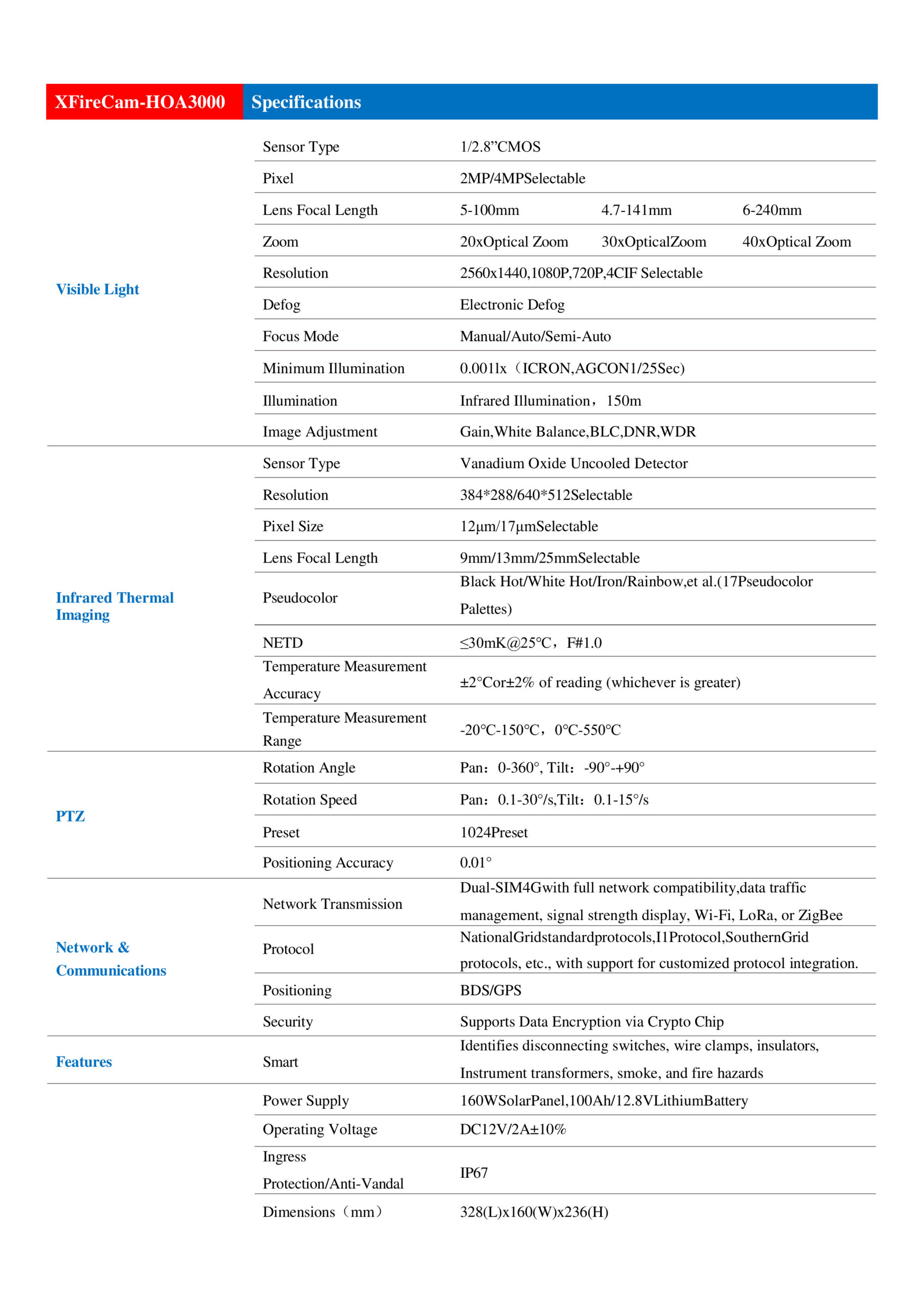 The XfireCam-HOA3000 is an AI-assisted live video and thermal wildfire monitoring system with GIS mapping capabilities, designed to provide situational awareness, data visualization, and event documentation based on camera sensor input and system specifications.